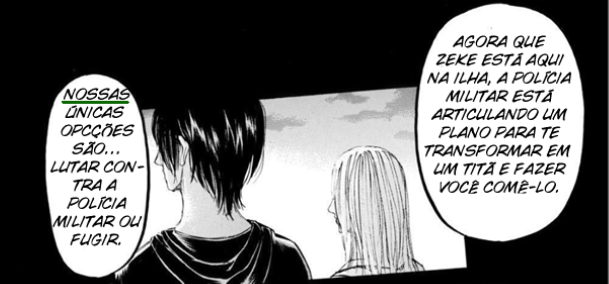 Com tudo isso dito, entendemos de forma diferente as palavras de Eren no capítulo 130 durante sua conversa com Historia. O Eren que vemos nessa situação não é mais o mesmo de antes, mas aquele que, novamente, está imerso em um abismo; talvez seja por isso que ele se lembra tão claramente do que aconteceu na caverna, pois é uma situação semelhante. E agora, esse abismo tem um nome mais aterrorizante do que qualquer outro: a consciência da predestinação. Este é o Eren que vemos ali. O Eren que revela seu plano a Historia sem nenhuma razão potencialmente necessária e lhe diz que suas únicas opções para impedir que a Polícia Militar cumpra sua missão são enfrentá-los ou fugir.